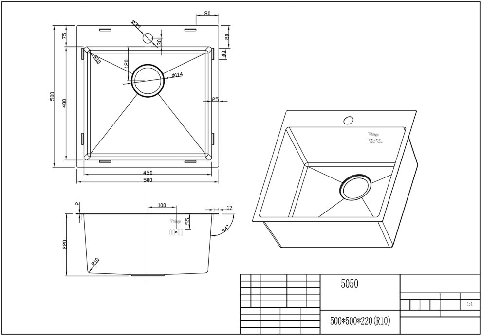 Vidage VS-5050 Мойка комбинированная сварная 50х50х21,5см, цвет золото, нерж.сталь