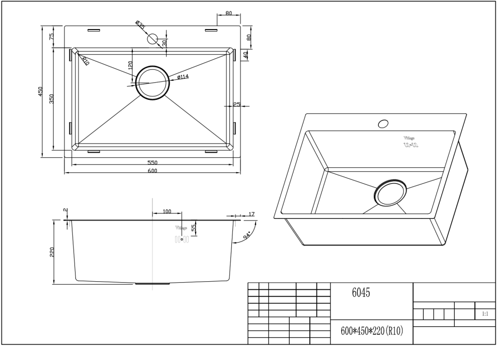 VS-6045 Мойка комбинированная сварная с сифоном 600х450х215мм, цвет сатин, нерж.сталь. Сифон в цвет мойки, крепления и инструкция по установке в комплекте. Мойка изготовлена из нержавеющей стали марки 304.