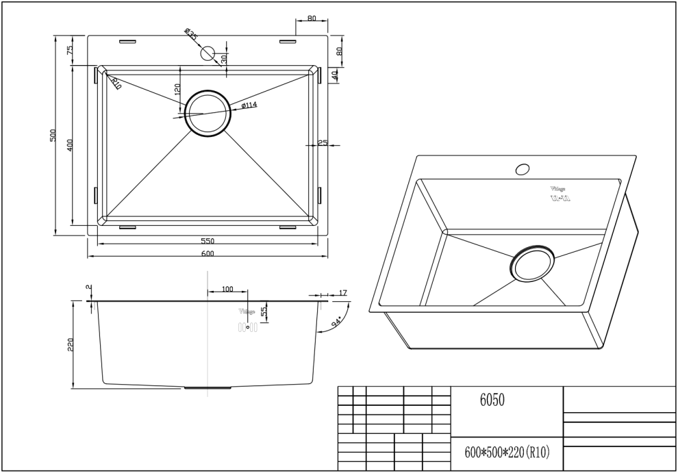 VS-6050 Мойка комбинированная сварная 600х500х215мм, цвет черный, нержавеющая сталь. Крепления и инструкция по установке в комплекте.